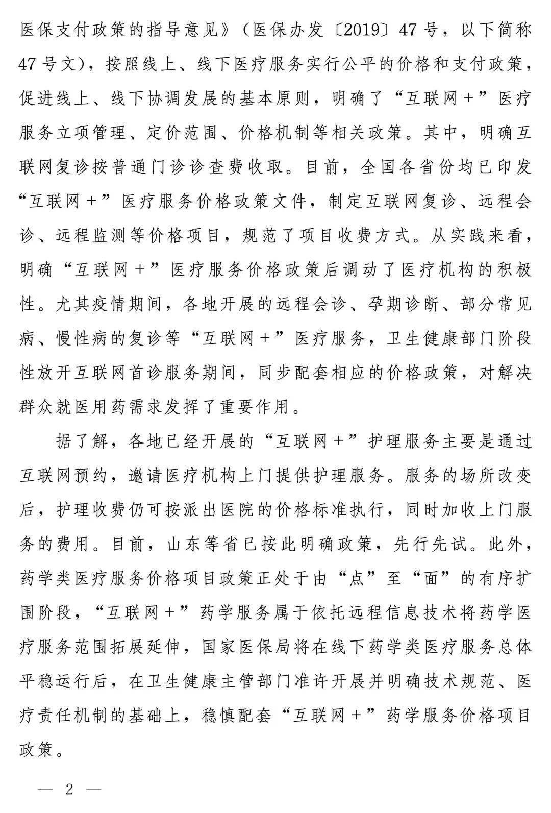 12月15日,国家医保局公布关于政协十四届全国委员会第一次会议第04560号 (医疗卫生类411号)提案答复的函指出,目前全国各省份均已印发“互联网+”医疗服务价格政策文件,制定互联网复诊、远程会诊、远程监测等价格项目,规范了项目收费方式。